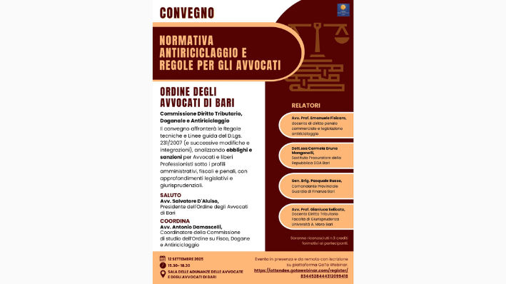 L’evoluzione normativa in materia di antiriciclaggio impone agli avvocati, e non solo, una sempre maggiore attenzione ai profili di legalità, trasparenza e conformità. Per questo motivo, l’Ordine degli Avvocati di Bari, tramite la Commissione di studio su Fisco, Dogane e Antiriciclaggio, ha organizzato un importante convegno in programma venerdì 12 settembre 2025 alle ore 15.30, […]