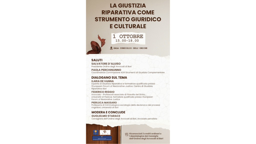 Il 1° ottobre 2025, nella sala consiglio dell’Ordine degli Avvocati di Bari, si terrà il convegno “La giustizia riparativa come strumento giuridico e culturale”, un appuntamento che intende approfondire uno dei temi più innovativi e complessi della giustizia penale contemporanea. Dopo i saluti istituzionali del presidente dell’Ordine, Salvatore D’Aluiso, e della consigliera Paola Perchinunno, coordinatrice […]