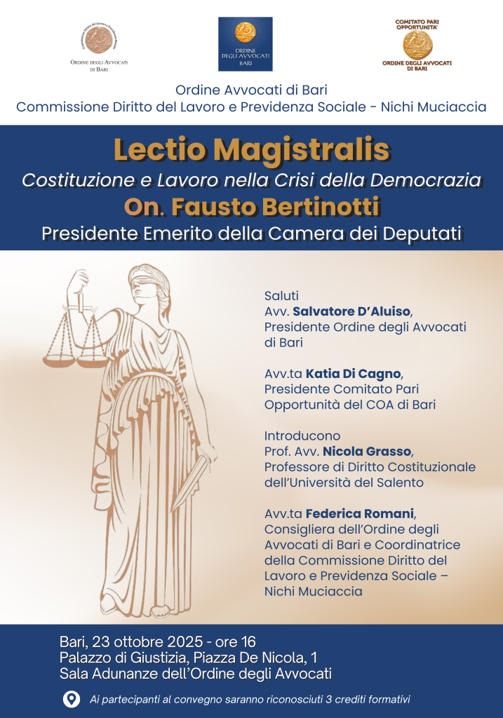 Una riflessione autorevole su tre pilastri della nostra Repubblica – Costituzione, lavoro e democrazia – sarà al centro dell’appuntamento promosso dall’Ordine degli Avvocati di Bari per giovedì 23 ottobre 2025, alle ore 16, nella sala delle adunanze del Palazzo di Giustizia (Piazza De Nicola 1). Protagonista della Lectio Magistralis sarà l’On. Fausto Bertinotti, presidente emerito […]